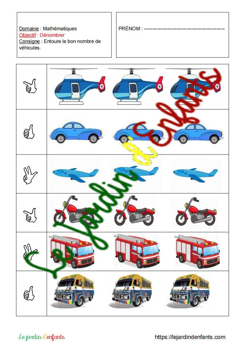 1 fiche : Compte les doigts, puis entoure le nombre de véhicules ( 1 à 3)