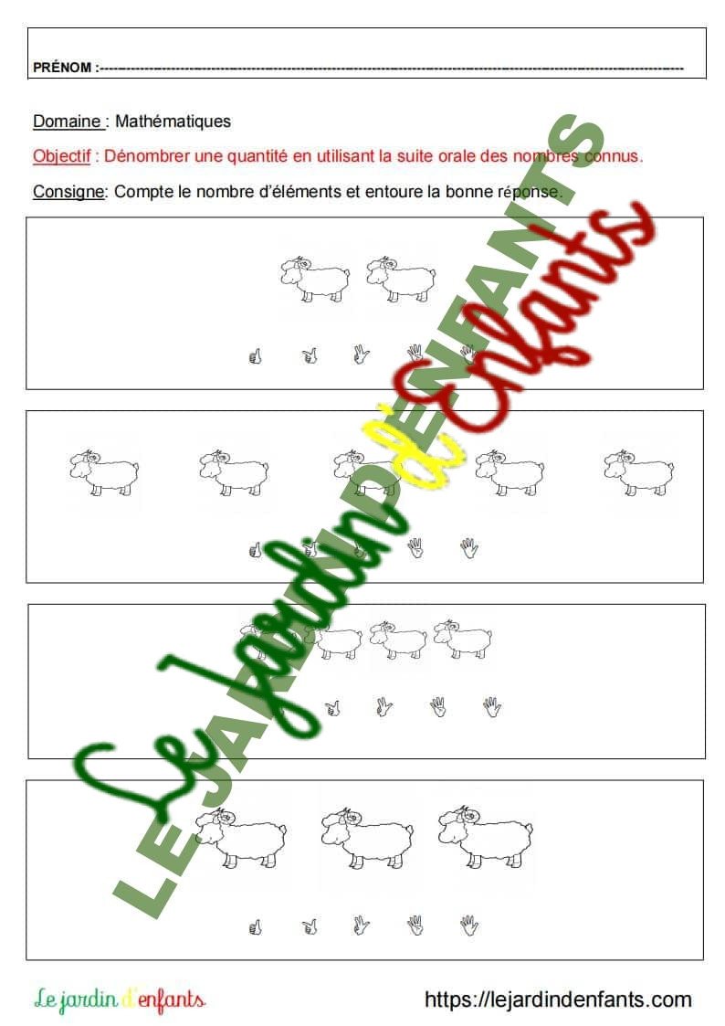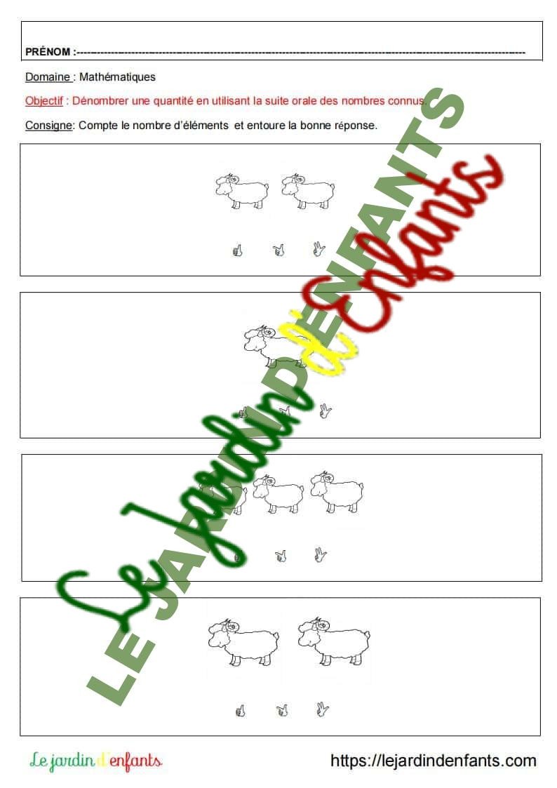 1 fiche : Compte les doigts, puis entoure le nombre de moutons ( 1 à 5)