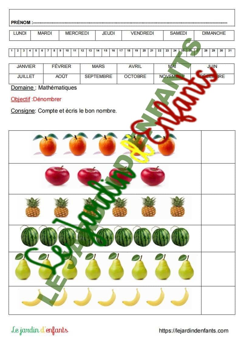 1 fiche : Compter et écrire le bon nombre de fruits (5 à 9)