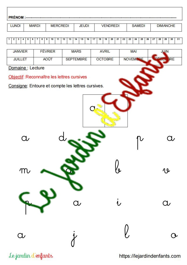 - L’inscription du prénom et de la date peut être réalisée à la fin de l’exercice, dans la mesure où l’objectif principal est de vérifier la compréhension et le respect de la consigne. L’enfant complète la date à l’aide d’un modèle.