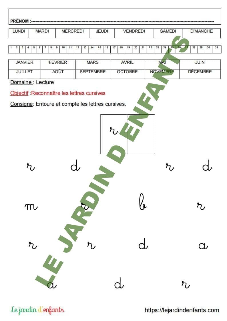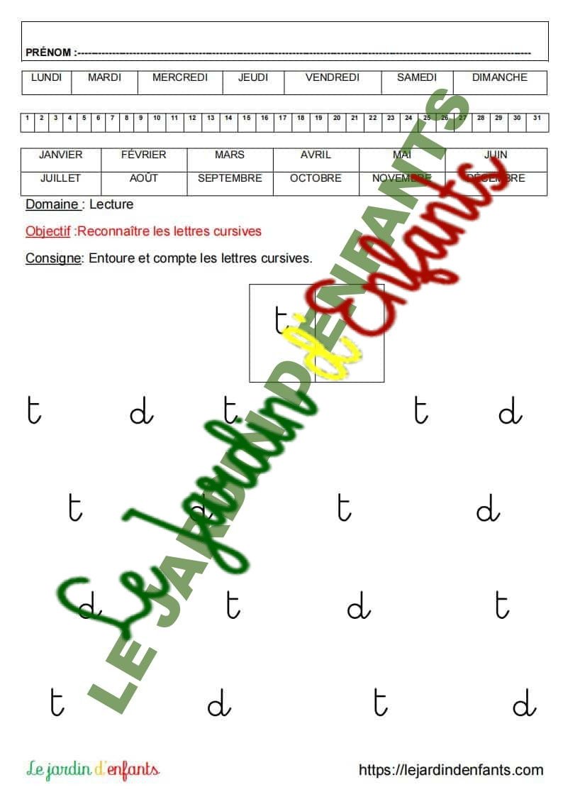 • L’inscription du prénom et de la date peut être réalisée à la fin de l’exercice, dans la mesure où l’objectif principal est de vérifier la compréhension et le respect de la consigne. L’enfant complète la date à l’aide d’un modèle.